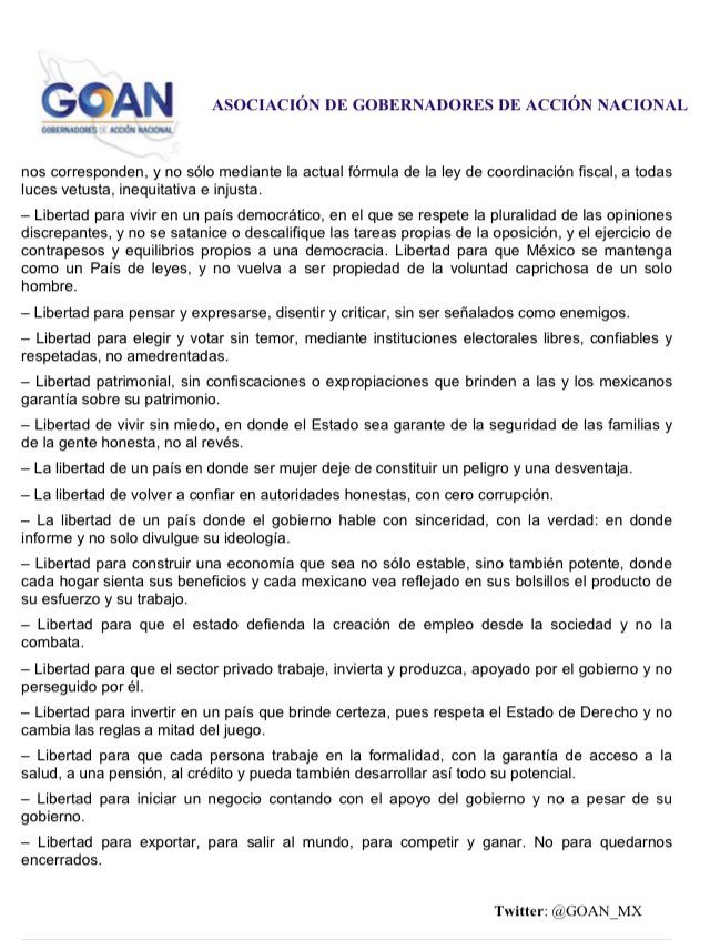 Un acuerdo de 27 puntos emitido por la Asociación de Gobernadores de Acción Nacional en el que resaltan el Acuerdo en Defensa de la Libertad, la Democracia y la Federación ahí destacan la atención urgente a la crisis económica derivada por el coronavirus COVID-19 además de indicar que quieren un nuevo pacto fiscal ya que consideran que la fórmula actual es “vetusta, inequitativa e injusta”.