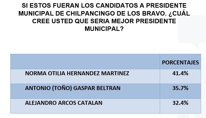 Destaca que las personas entrevistas en este ejercicio consideran que Norma Otilia Hernández sería mejor presidente municipal con el 41.4% le sigue Antonio Gaspar actual alcalde con un 35.7% y por último Alejandro Arcos joven político que recientemente fue nominado candidato de la alianza en el Partido Revolucionario Institucional y el de la Revolución Democrática con un 32.4%.