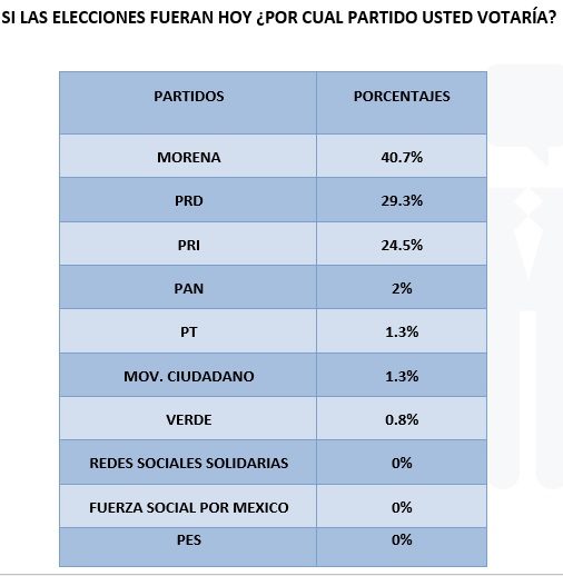 Extra.  El Partido del Trabajo (PT); Movimiento Ciudadano (MC); Verde Ecologista (PVEM); Fuerza Social por México y Redes Sociales Solidarias serían los partidos menos votados o por los que los encuestados no lo harían.