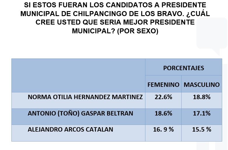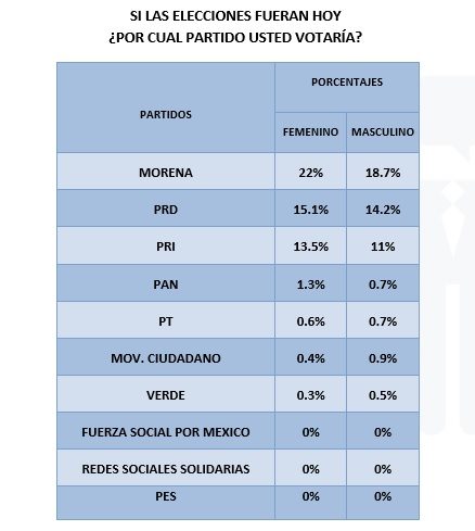Por último, la encuesta segmentada por sexo ubica una clara tendencia del género femenino a favor de Norma Otilia Hernández al igual que del masculino, no obstante, los hombres decantan en un 17.1% que sería mejor presidente Antonio Gaspar. Al ser cuestionados si las elecciones fueran hoy por cuál partido votarán tanto mujeres como hombres lo harían por Morena en Chilpancingo.
