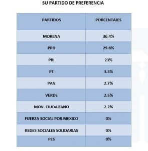 Regresando a los datos que presenta el también experto en Neurociencia Manuel Ángel Rodríguez uno que hace patente que Morena encabeza las preferencias con el 40.7% sin embargo, comparado con los porcentajes obtenidos para el PRI y el PRD estos números los ubican como partidos competitivos y con posibilidades reales de disputar el triunfo a quien lidera en la encuesta.
