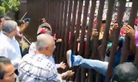Un maestro lanza una patada al líder del Congreso, Antonio Helguera y a los diputados Alfredo Sánchez y Ricardo Castillo, durante la...