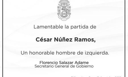 El secretario general de Gobierno Florencio Salazar Adame lamentó el fallecimiento de César Núñez Ramos “un honorable hombre de izquierda”, agregó Salazar...