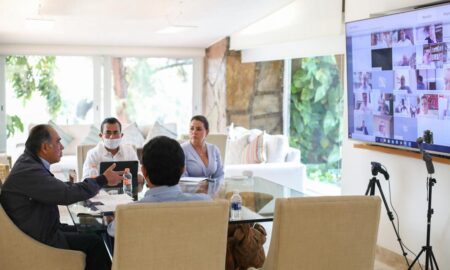 El gobernador Héctor Astudillo en videoconferencia con otros mandatarios estatales y el secretario de Turismo de México Miguel Torruco y el subsecretario...